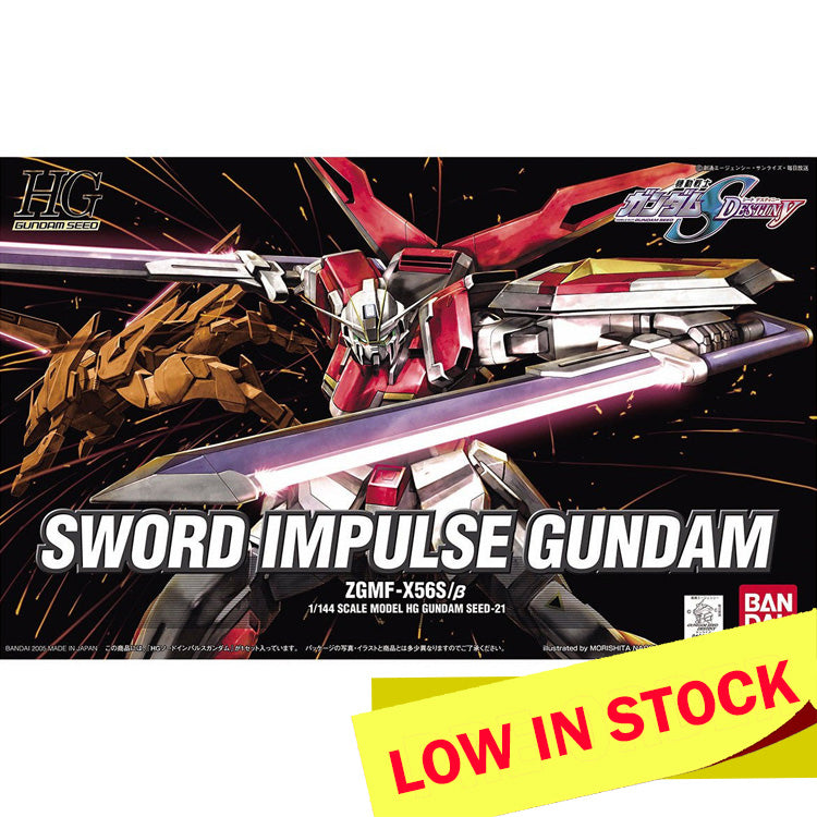 Based on the Mobile Suit Gundam SEED MSV, the Sword Impulse Gundam model kit is in 1/144 scale and becomes a fully articulated figure once complete. The Sword Impulse Gundam comes armed with a beam rifle, shield, and a pair of "Excalibur" anti-ship laser swords.